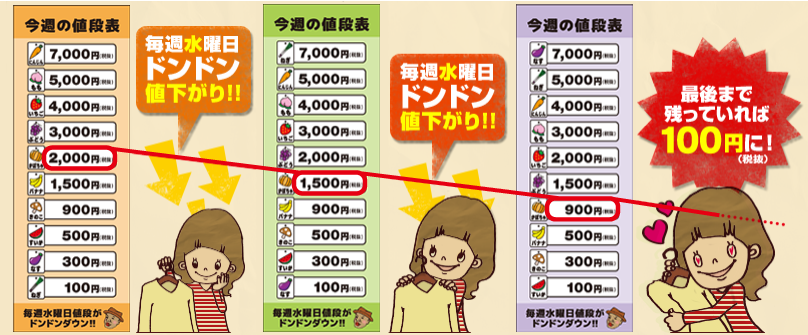 ※ 100円(税抜)だった野菜に関しましては、次週の水曜日に7,000円(税抜)の商品に付きます。
