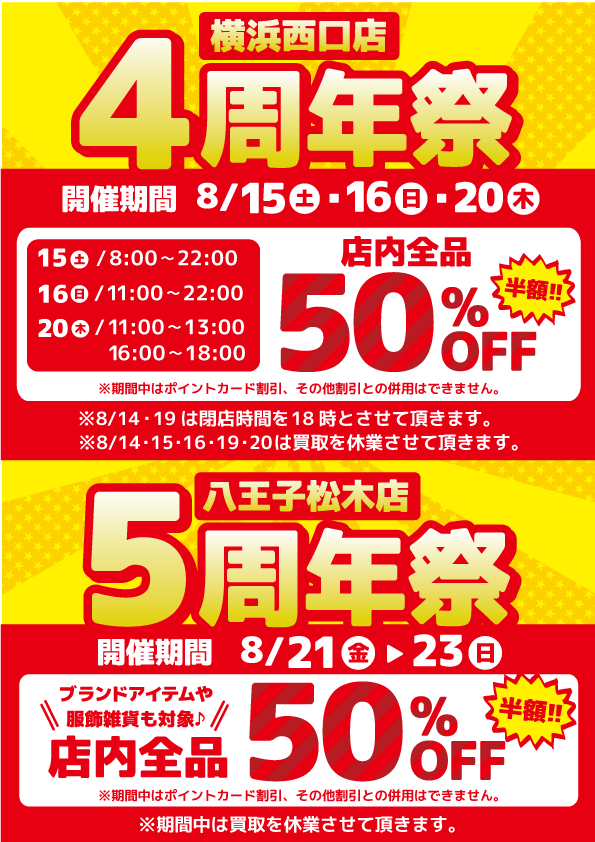 横浜西口店、八王子松木店 「周年祭」開催!!
